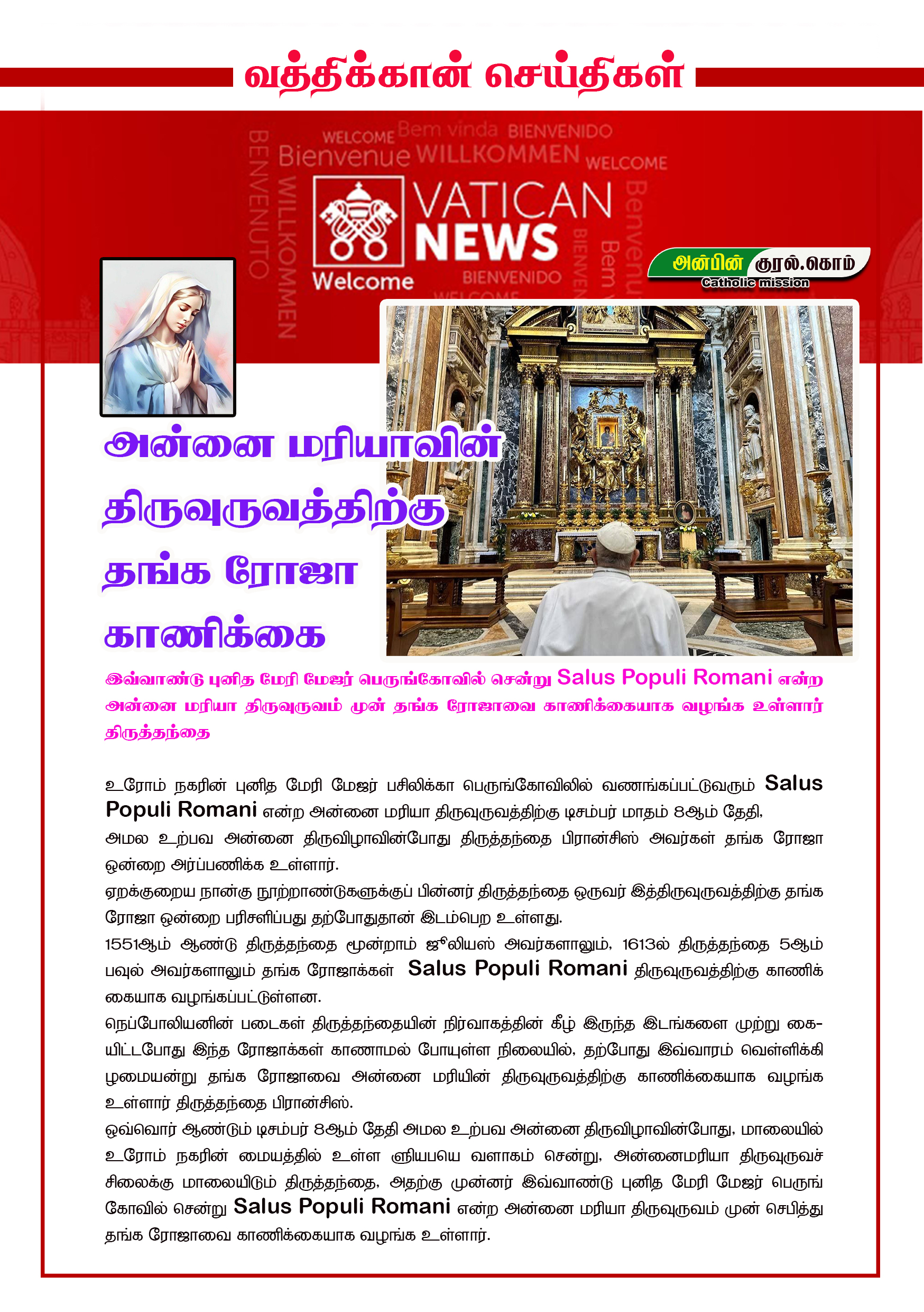 Post navigation புனித செபஸ்தியார் (இறப்பு சுமார். 288) என்பவர் ஆதி கிறித்தவ புனிதரும் மறைசாட்சியும் ஆவார். இவர் உரோமைப் பேரரசன் தியோக்கிளேசியன் கிறித்தவர்களுக்கு எதிராகத் துவங்கிய கொடுமைகளில் இறந்தார். இவர் பெரும்பான்மையாக மரத்திலோ, தூணிலோ கட்டப்பட்டவாறு, அம்புகளால் குத்தப்பட்டு சித்தரிக்கப்படாலும், இவர் அங்கு இறக்கவில்லை. இவரை அங்கிருந்து உரோம் நகரின் ஐரீன் என்பவர் காப்பாற்றி குணப்படுத்தினார். இதன் பின்பு தியோக்கிளேசியனின் செயல்களை இவர் சாடியதால், அரசனின் ஆணைப்படி இவரை தடியால் அடித்துக் கொலை செய்தனர். வத்திக்கான் வளாகத்தில் கிறிஸ்துமஸ் மரம்