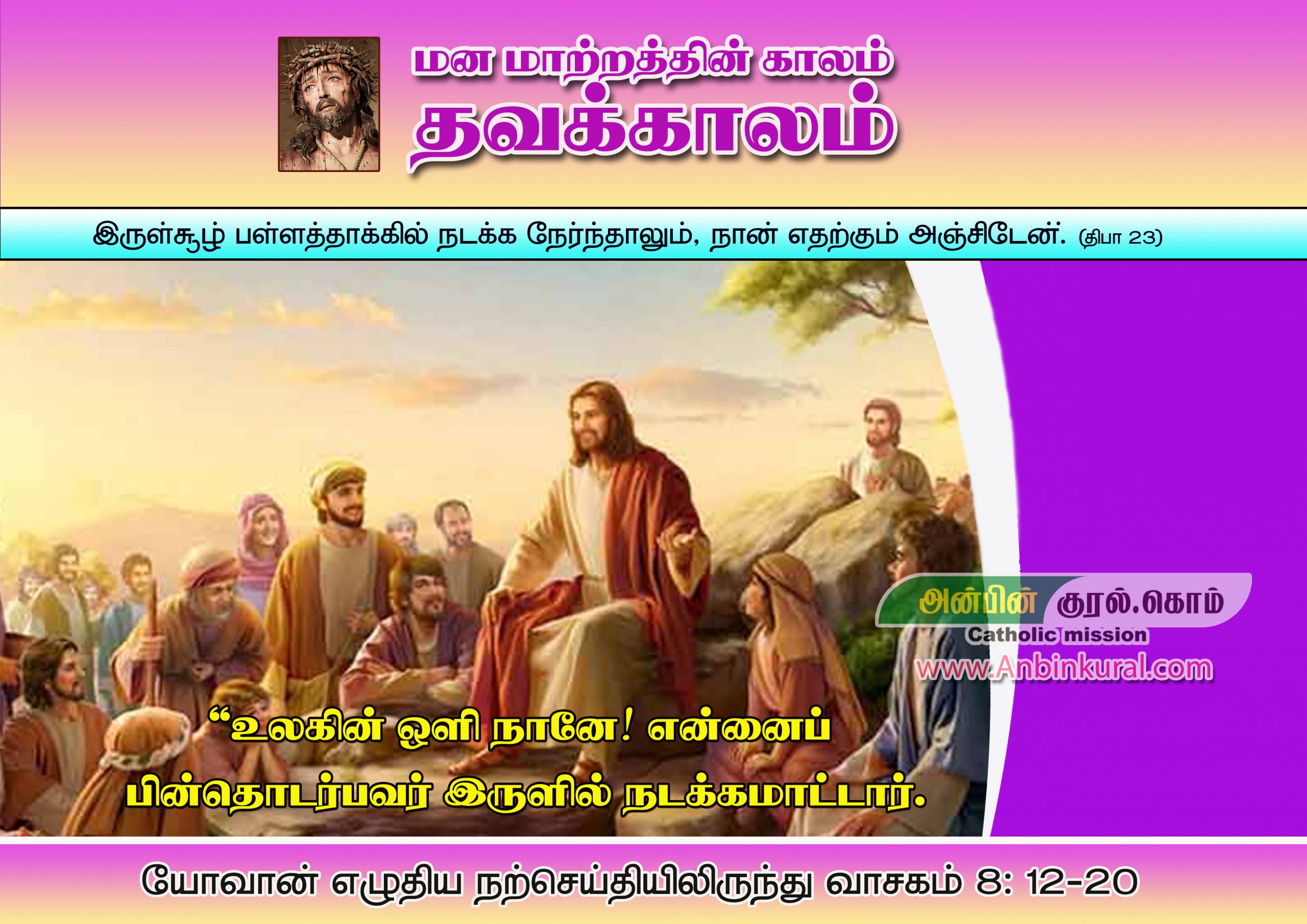 இயேசு மக்களைப் பார்த்து, “உலகின் ஒளி நானே; என்னைப் பின்தொடர்பவர் இருளில் நடக்கமாட்டார்; வாழ்வுக்கு வழி காட்டும் ஒளியைக் கொண்டிருப்பார்” என்றார். பரிசேயர் அவரிடம், “உம்மைப்பற்றி நீரே சான்று பகர்கிறீர்; உம் சான்று செல்லாது” என்றனர்.