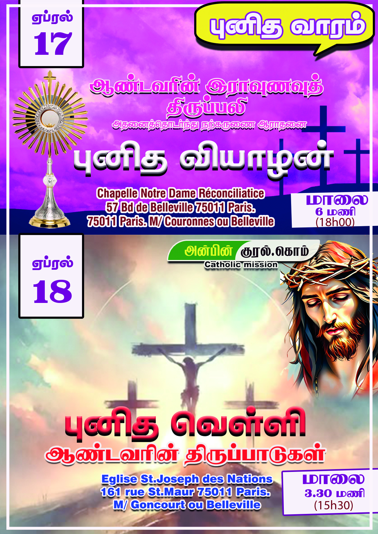 Post navigation இலங்கைத் தமிழ் கத்தோலிக்க ஆன்மிகப்பணிகத்தின் ஏற்பாட்டில் தவக்காலச் சிறப்புத் தியானம்ஏதிர்வரும்ஞாயிறு 06.04.2025 வயல் மாதா ஆலயத்தில் நடைபெறுமென பணியக இயக்குனர் அருட்பணி போல் மத்தியு மதன்ராச் அறிவித்துள்ளார். புனித சனி மற்றும் உயிர்ப்பு ஞாயிறு திருப்பலிகளும் நேரங்கள் மாற்றம் செய்யப்பட்டுள்ளதுஅன்புடன் கவனத்தில் கொள்ளவும் பகிர்தலுக்கு நன்றி