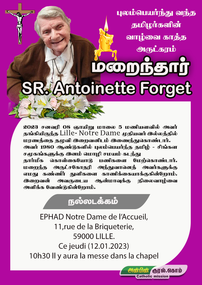 Post navigation முதலாம் ஆண்டு நினைவஞ்சலி எமது ஆன்மிகப்பணியகத்தில் நீண்டகால திருஇசைக் கலைஞராகப் பணியாற்றிய ஆசிரியர் திரு. சின்னப்பன் மரியதாஸ் அவர்களின் நல்லடக்க நிகழ்வுகள் பற்றிய அறிவித்தல் உறவுகளும், நண்பர்களும் இவ்வறிவித்தலை ஏற்றுக்கொள்ளுமாறு ஆழ்ந்த கவலையுடன் அறியத்தருகின்றோம்.நன்றி