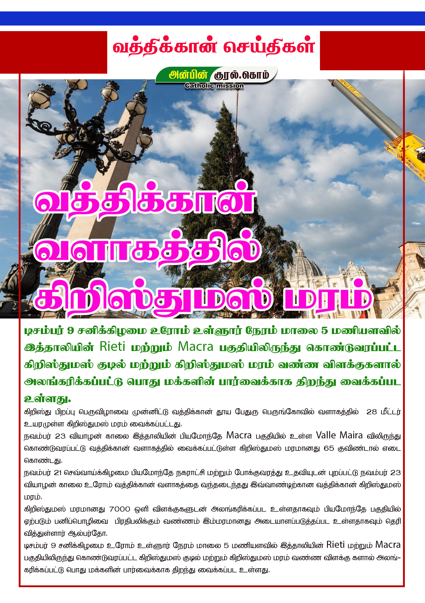 டிசம்பர் 9 சனிக்கிழமை உரோம் உள்ளூர் நேரம் மாலை 5 மணியளவில் இத்தாலியின் Rieti மற்றும் Macra பகுதியிலிருந்து கொண்டுவரப்பட்ட கிறிஸ்துமஸ் குடில் மற்றும் கிறிஸ்துமஸ் மரம் வண்ண விளக்குகளால் அலங்கரிக்கப்பட்டு பொது மக்களின் பார்வைக்காக திறந்து வைக்கப்பட உள்ளது.