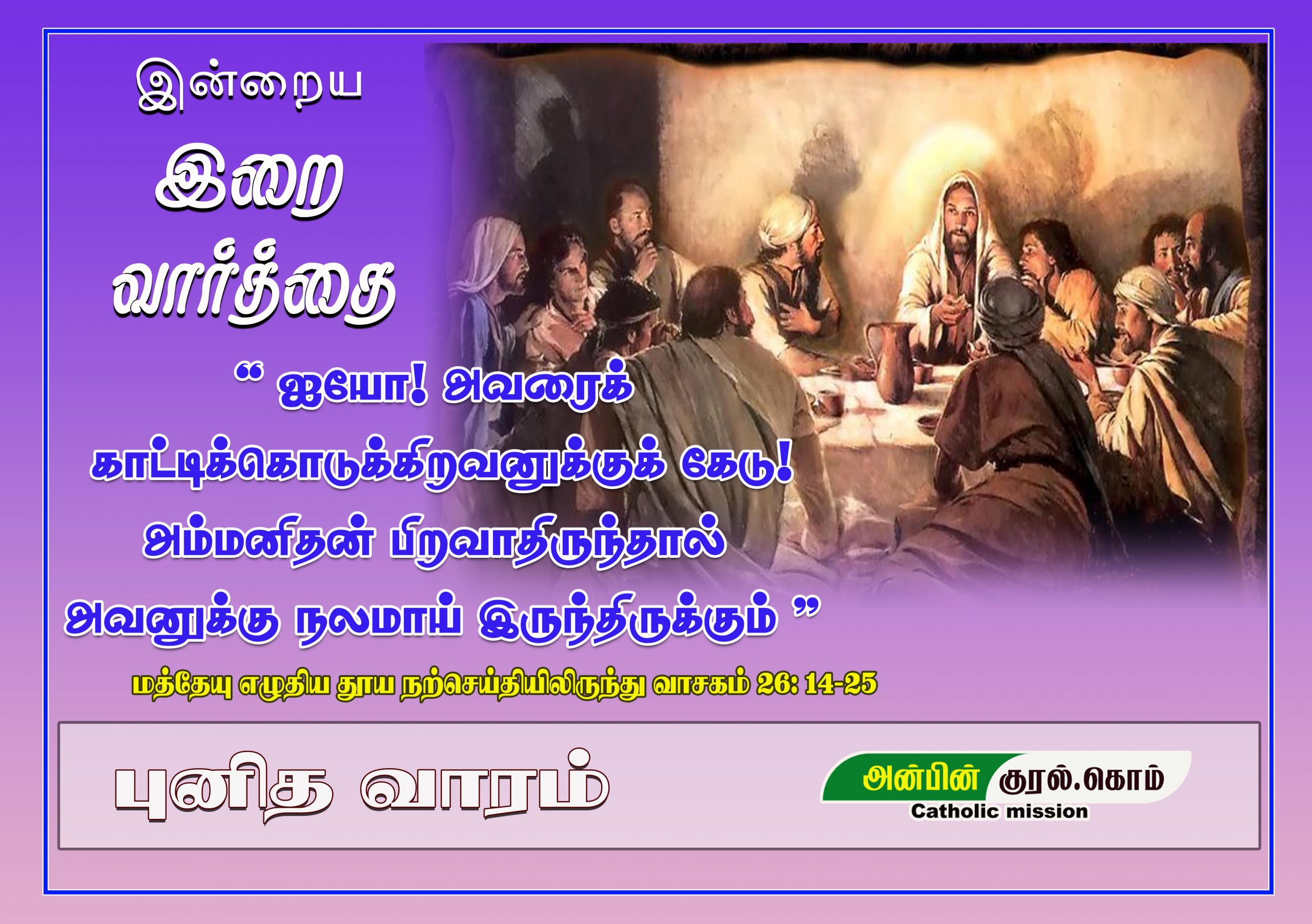 மாலை வேளையானதும் அவர் பன்னிருவரோடும் பந்தியில் அமர்ந்தார். அவர்கள் உண்டுகொண்டிருந்தபொழுது அவர், ‘‘உங்களுள் ஒருவன் என்னைக் காட்டிக்கொடுப்பான் என உறுதியாக உங்களுக்குச் சொல்கிறேன்” என்றார். அப்பொழுது அவர்கள் மிகவும் வருத்தமுற்றவர்களாய், ‘‘ஆண்டவரே, அது நானோ?” என ஒவ்வொருவரும் அவரிடம் கேட்கத் தொடங்கினார்கள். அதற்கு அவர், ‘‘என்னுடன் பாத்திரத்தில் தொட்டு உண்பவனே என்னைக் காட்டிக்கொடுப்பான். மானிடமகன், தம்மைப்பற்றி மறைநூலில் எழுதியுள்ளபடியே போகிறார். ஆனால், ஐயோ! அவரைக் காட்டிக்கொடுக்கிறவனுக்குக் கேடு; அம்மனிதன் பிறவாதிருந்தால் அவனுக்கு நலமாய் இருந்திருக்கும்” என்றார். அவரைக் காட்டிக்கொடுத்த யூதாசும் ‘‘ரபி, நானோ?” என அவரிடம் கேட்க, இயேசு, ‘‘நீயே சொல்லிவிட்டாய்” என்றார்.