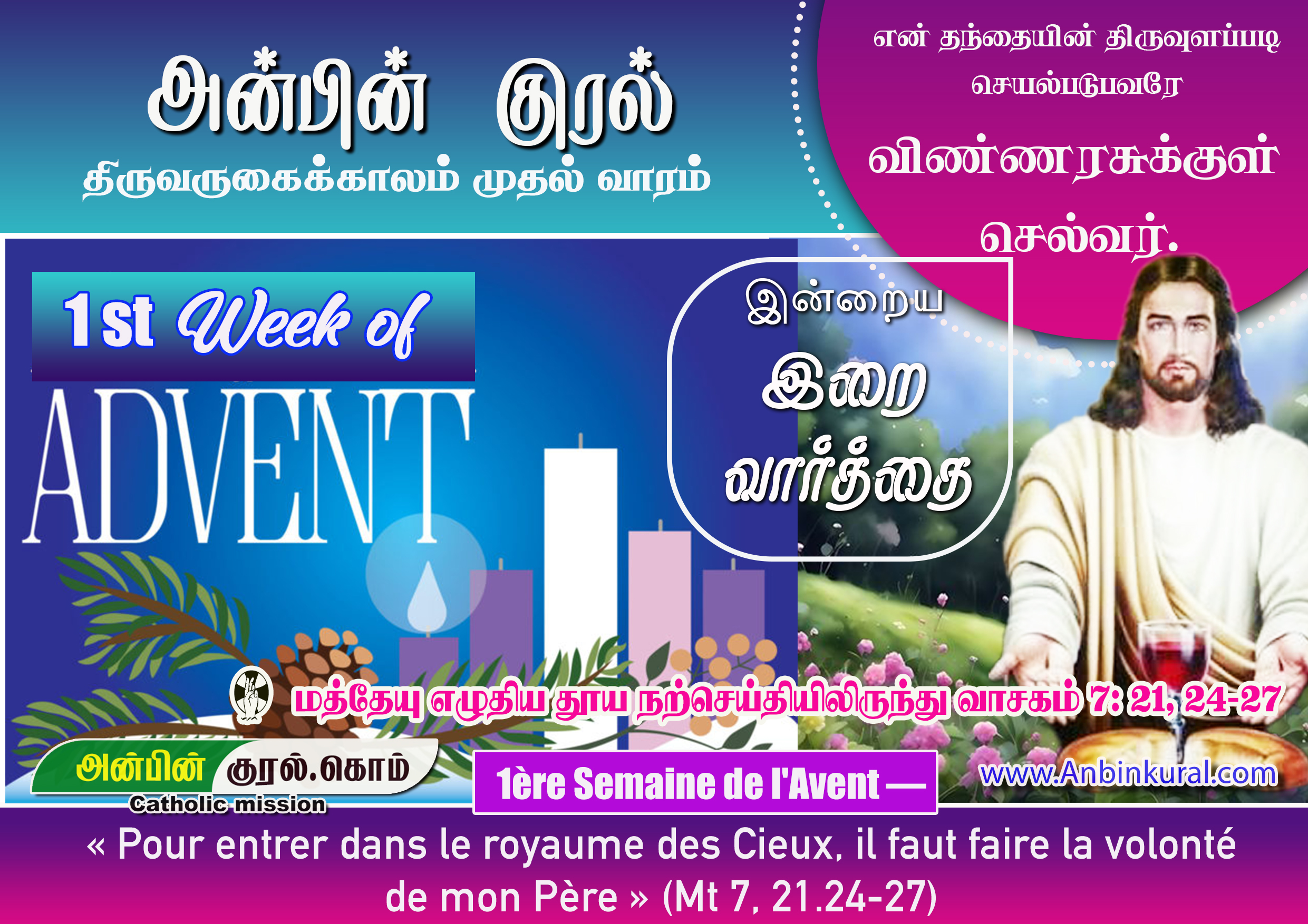 இயேசு தம் சீடரை நோக்கிக் கூறியது: “என்னை நோக்கி, ‘ஆண்டவரே, ஆண்டவரே’ எனச் சொல்பவரெல்லாம் விண்ணரசுக்குள் செல்வதில்லை. மாறாக, விண்ணுலகிலுள்ள என் தந்தையின் திருவுளத்தின்படி செயல்படுபவரே செல்வர்.