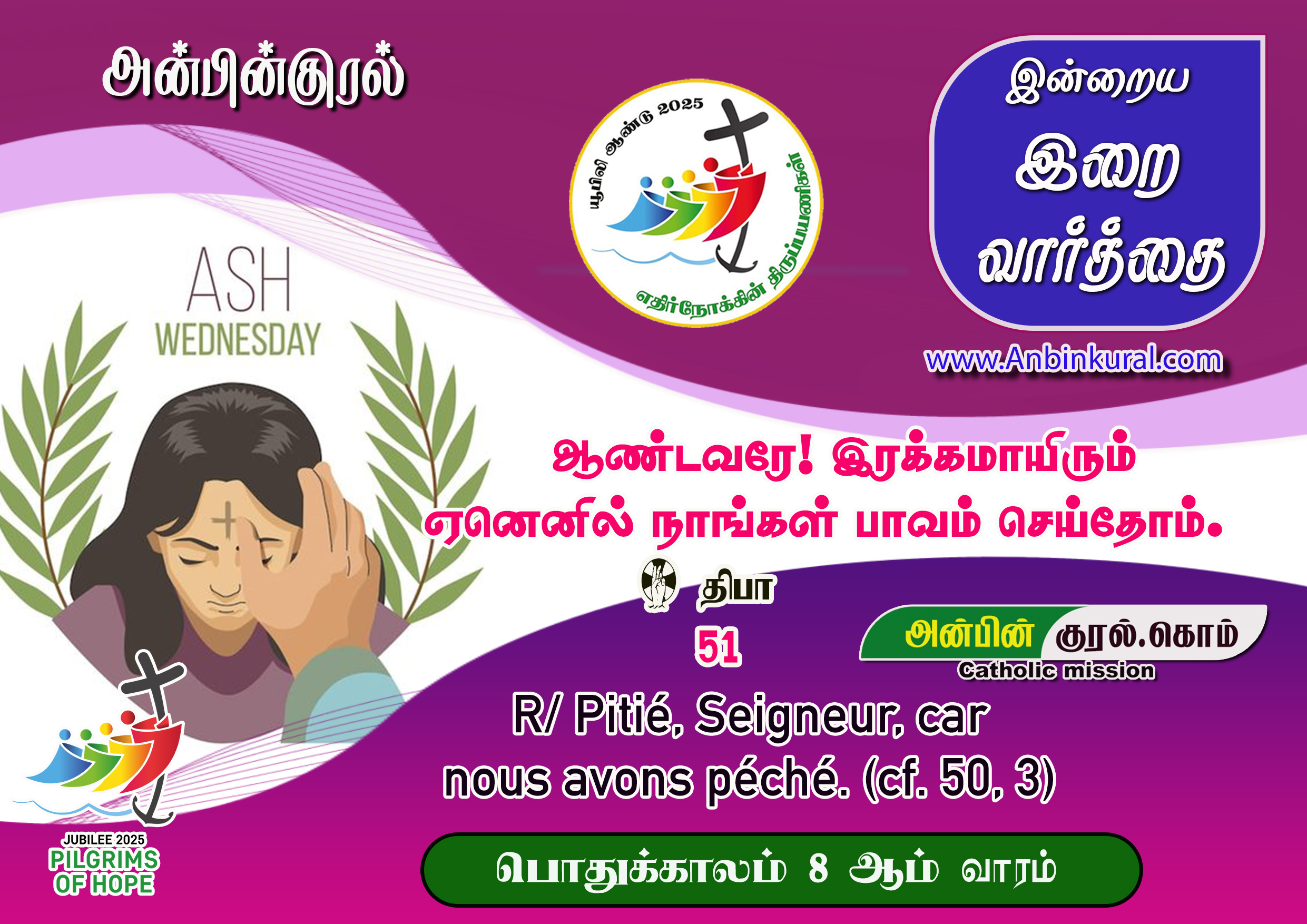 பல்லவி: ஆண்டவரே! இரக்கமாயிரும்; ஏனெனில் நாங்கள் பாவம் செய்தோம்.1கடவுளே! உமது பேரன்புக்கேற்ப எனக்கு இரங்கும்; உமது அளவற்ற இரக்கத்திற்கேற்ப என் குற்றங்களைத் துடைத்தருளும்.2என் தீவினை முற்றிலும் நீங்கும்படி என்னைக் கழுவியருளும்; என் பாவம் அற்றுப்போகும்படி என்னைத் தூய்மைப்படுத்தியருளும். – பல்லவி