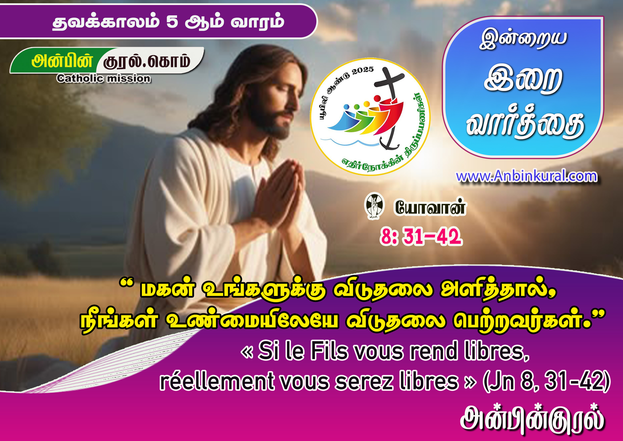 இயேசு தம்மை நம்பிய யூதர்களை நோக்கி, “என் வார்த்தைகளை நீங்கள் தொடர்ந்து கடைப்பிடித்து வந்தால் உண்மையில் என் சீடர்களாய் இருப்பீர்கள்; உண்மையை அறிந்தவர்களாயும் இருப்பீர்கள். உண்மை உங்களுக்கு விடுதலை அளிக்கும்” என்றார். யூதர்கள் அவரைப் பார்த்து, “ ‘உங்களுக்கு விடுதலை கிடைக்கும்’ என நீர் எப்படிச் சொல்லலாம்? நாங்கள் யாருக்கும் ஒருபோதும் அடிமைகளாய் இருந்ததில்லை. நாங்கள் ஆபிரகாமின் வழிமரபினர் ஆயிற்றே!” என்றார்கள். அதற்கு இயேசு, “பாவம் செய்யும் எவரும் பாவத்திற்கு அடிமை என உறுதியாக உங்களுக்குச் சொல்கிறேன். வீட்டில் அடிமைக்கு நிலையான இடம் இல்லை; மகனுக்கு அங்கு என்றென்றும் இடம் உண்டு. மகன் உங்களுக்கு விடுதலை அளித்தால் நீங்கள் உண்மையிலே விடுதலை பெற்றவர்களாய் இருப்பீர்கள். நீங்கள் ஆபிரகாமின் வழிமரபினர் என்பது எனக்குத் தெரியும். ஆனால் என் வார்த்தை உங்கள் உள்ளத்தில் இடம் பெறாததால் நீங்கள் என்னைக் கொல்ல முயலுகிறீர்கள். நான் என் தந்தையிடம் கண்டதைச் சொல்கிறேன். நீங்கள் உங்கள் தந்தையிடமிருந்து கேட்டதைச் செய்கிறீர்கள்” என்றார்.