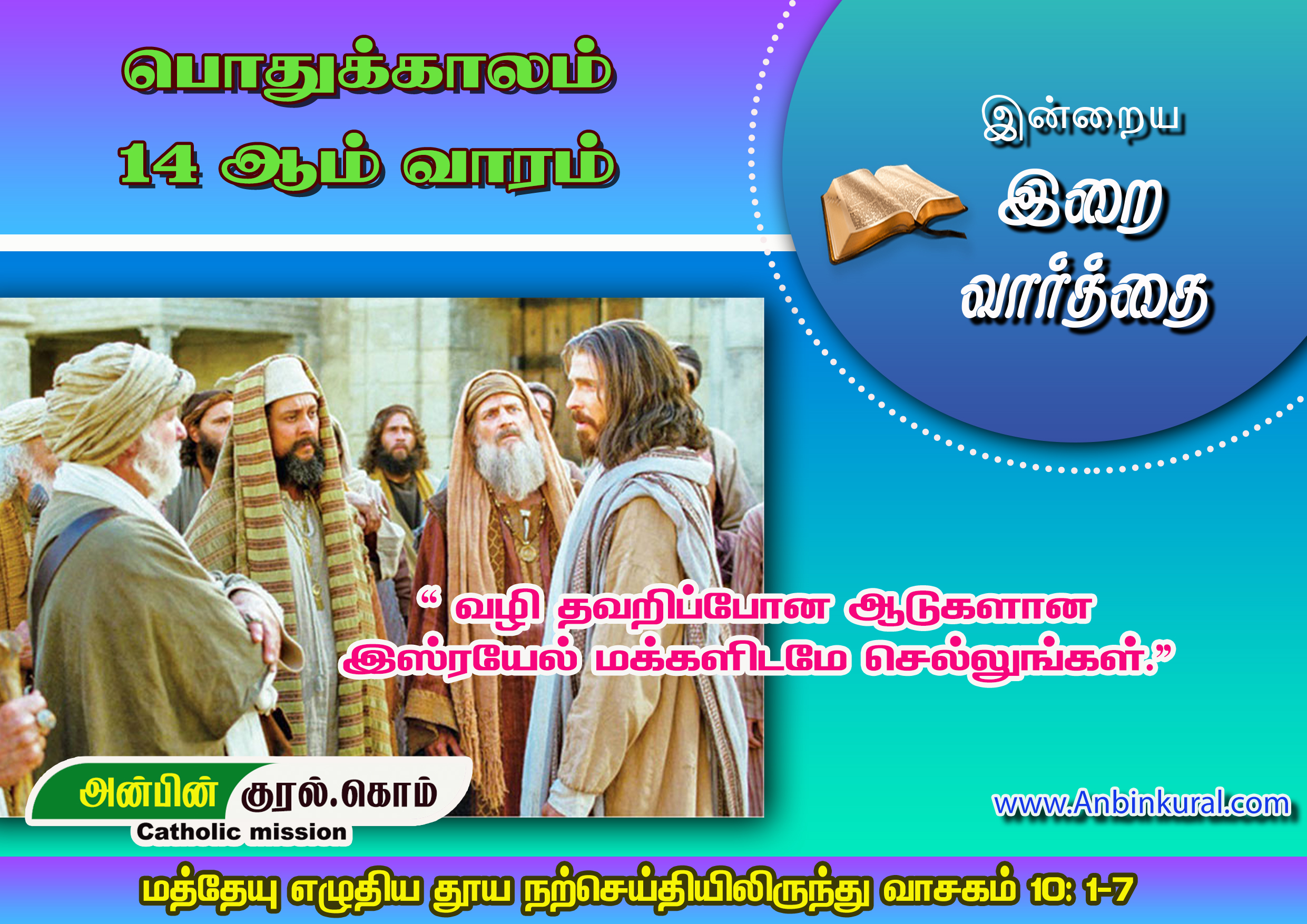 இயேசு இந்தப் பன்னிருவரையும் அனுப்பியபோது அவர்களுக்கு அறிவுரையாகக் கூறியது: “பிற இனத்தாரின் எப்பகுதிக்கும் செல்ல வேண்டாம். சமாரியாவின் நகர் எதிலும் நுழைய வேண்டாம். மாறாக, வழி தவறிப்போன ஆடுகளான இஸ்ரயேல் மக்களிடமே செல்லுங்கள். அப்படிச் செல்லும்போது ‘விண்ணரசு நெருங்கி வந்துவிட்டது’ எனப் பறைசாற்றுங்கள்.”