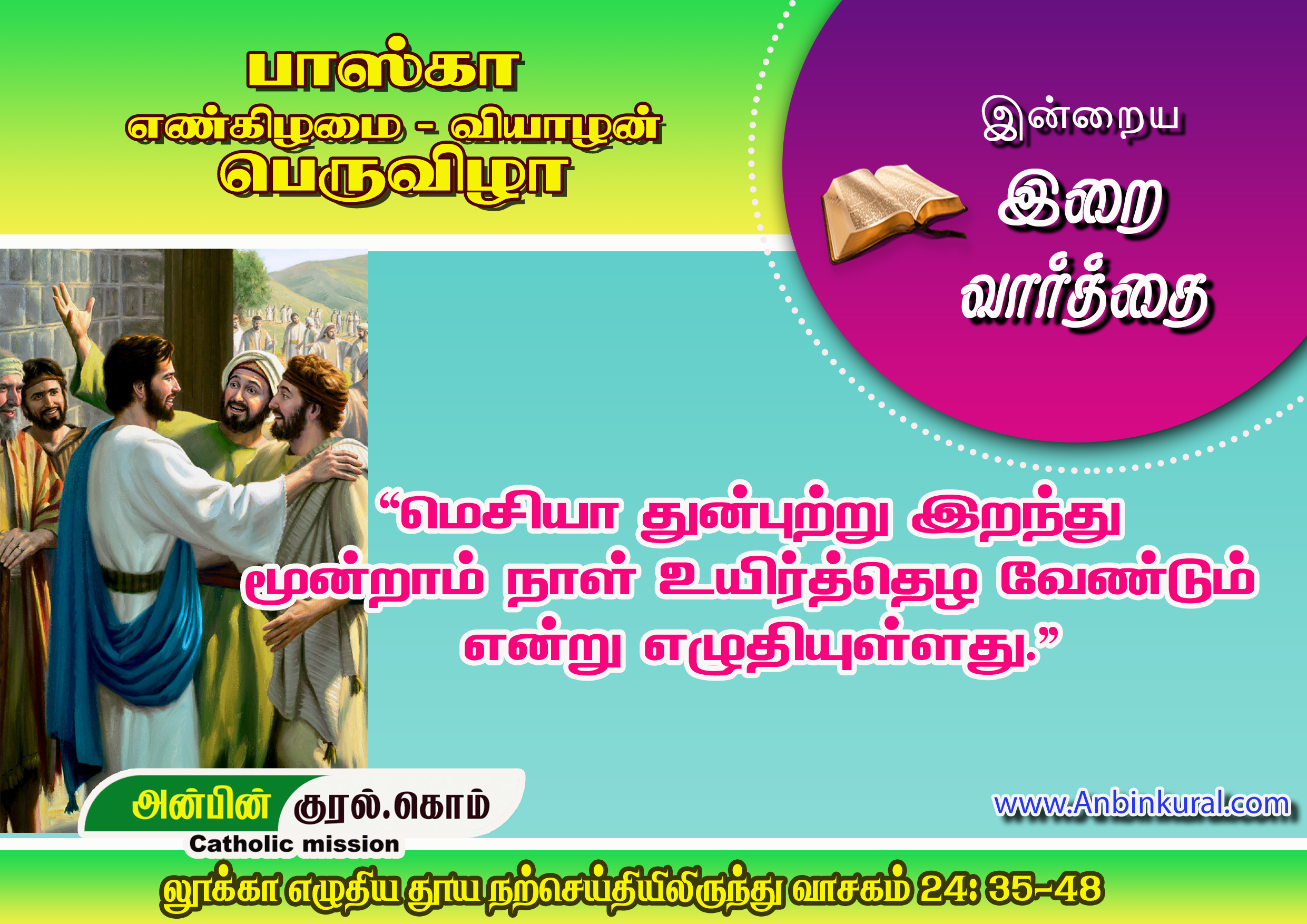 பின்பு அவர் அவர்களைப் பார்த்து, ‘‘மோசேயின் சட்டத்திலும் இறைவாக்கினர் நூல்களிலும் திருப்பாடல்களிலும் என்னைப்பற்றி எழுதப்பட்டுள்ள அனைத்தும் நிறைவேற வேண்டும் என்று நான் உங்களோடு இருந்தபோதே உங்களுக்குச் சொல்லியிருந்தேனே” என்றார்; அப்போது மறைநூலைப் புரிந்துகொள்ளுமாறு அவர்களுடைய மனக் கண்களைத் திறந்தார். அவர் அவர்களிடம், ‘‘மெசியா துன்புற்று இறந்து மூன்றாம் நாள் உயிர்த்தெழ வேண்டும் என்றும், பாவமன்னிப்புப் பெற மனம் மாறுங்கள் என எருசலேம் தொடங்கி அனைத்து நாடுகளிலும் அவருடைய பெயரால் பறைசாற்றப்பட வேண்டும் என்றும் எழுதியுள்ளது. இவற்றுக்கு நீங்கள் சாட்சிகள்” என்றார்.