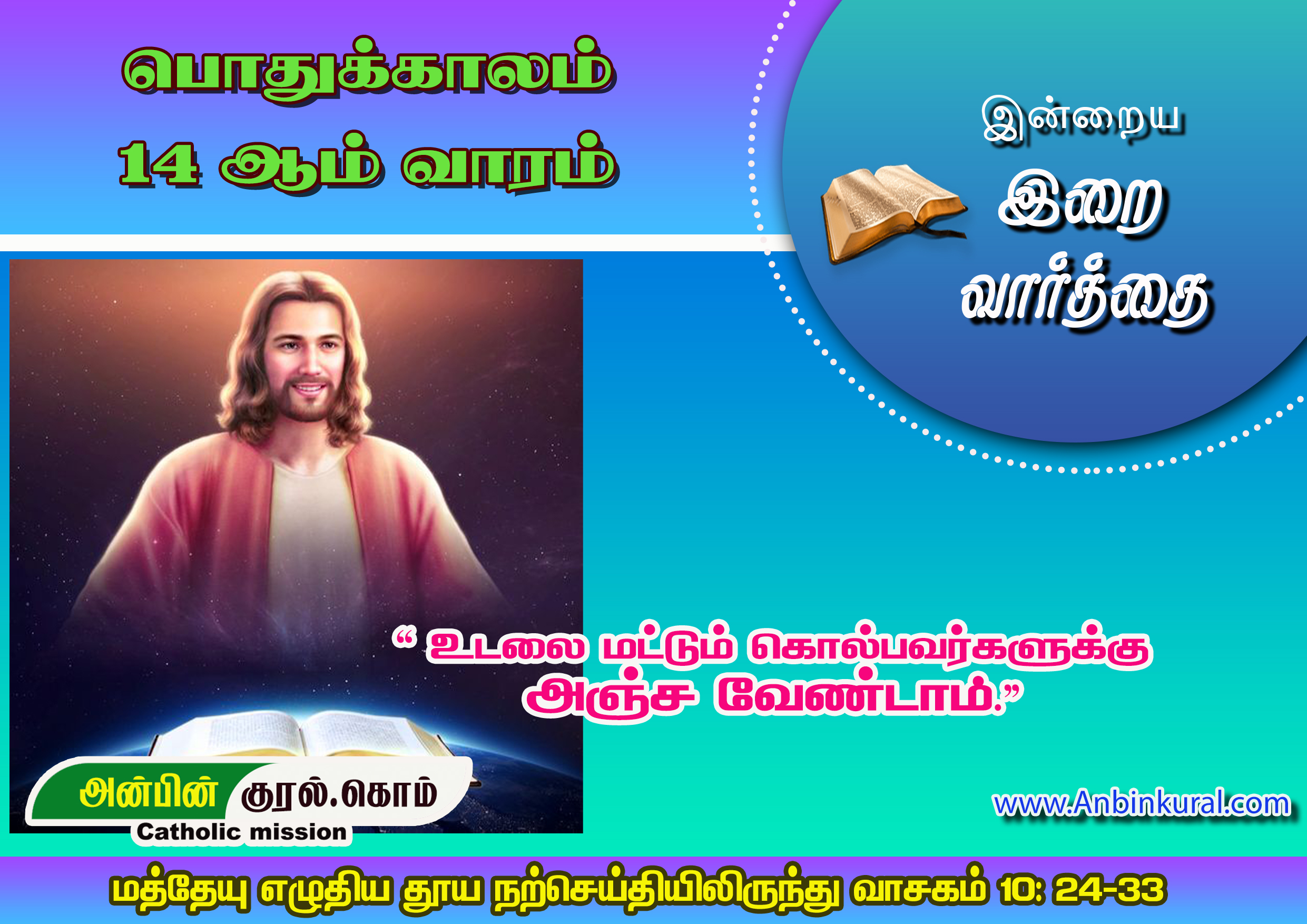 ஆன்மாவைக் கொல்ல இயலாமல், உடலை மட்டும் கொல்பவர்களுக்கு அஞ்ச வேண்டாம். ஆன்மாவையும் உடலையும் நரகத்தில் அழிக்க வல்லவருக்கே அஞ்சுங்கள். காசுக்கு இரண்டு சிட்டுக் குருவிகள் விற்பதில்லையா? எனினும் அவற்றுள் ஒன்றுகூட உங்கள் தந்தையின் விருப்பமின்றித் தரையில் விழாது. உங்கள் தலைமுடியெல்லாம் எண்ணப்பட்டிருக்கின்றது. சிட்டுக் குருவிகள் பலவற்றைவிட நீங்கள் மேலானவர்கள். எனவே அஞ்சாதிருங்கள்.