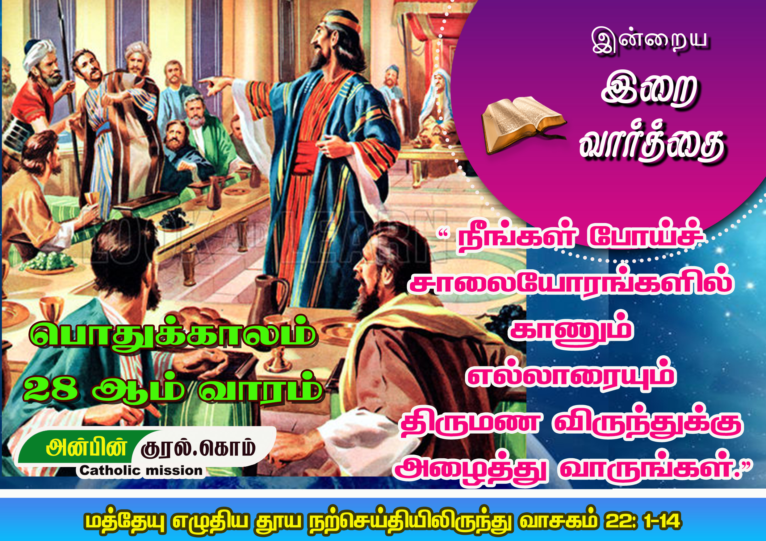 பின்னர் தம் பணியாளர்களிடம், ‘திருமண விருந்து ஏற்பாடாகி உள்ளது. அழைக்கப் பெற்றவர்களோ தகுதியற்றுப் போனார்கள். எனவே நீங்கள் போய்ச் சாலையோரங்களில் காணும் எல்லாரையும் திருமண விருந்துக்கு அழைத்து வாருங்கள்’ என்றார். அந்தப் பணியாளர்கள் வெளியே சென்று வழியில் கண்ட நல்லோர், தீயோர் யாவரையும் கூட்டி வந்தனர். திருமண மண்டபம் விருந்தினரால் நிரம்பியது.”
