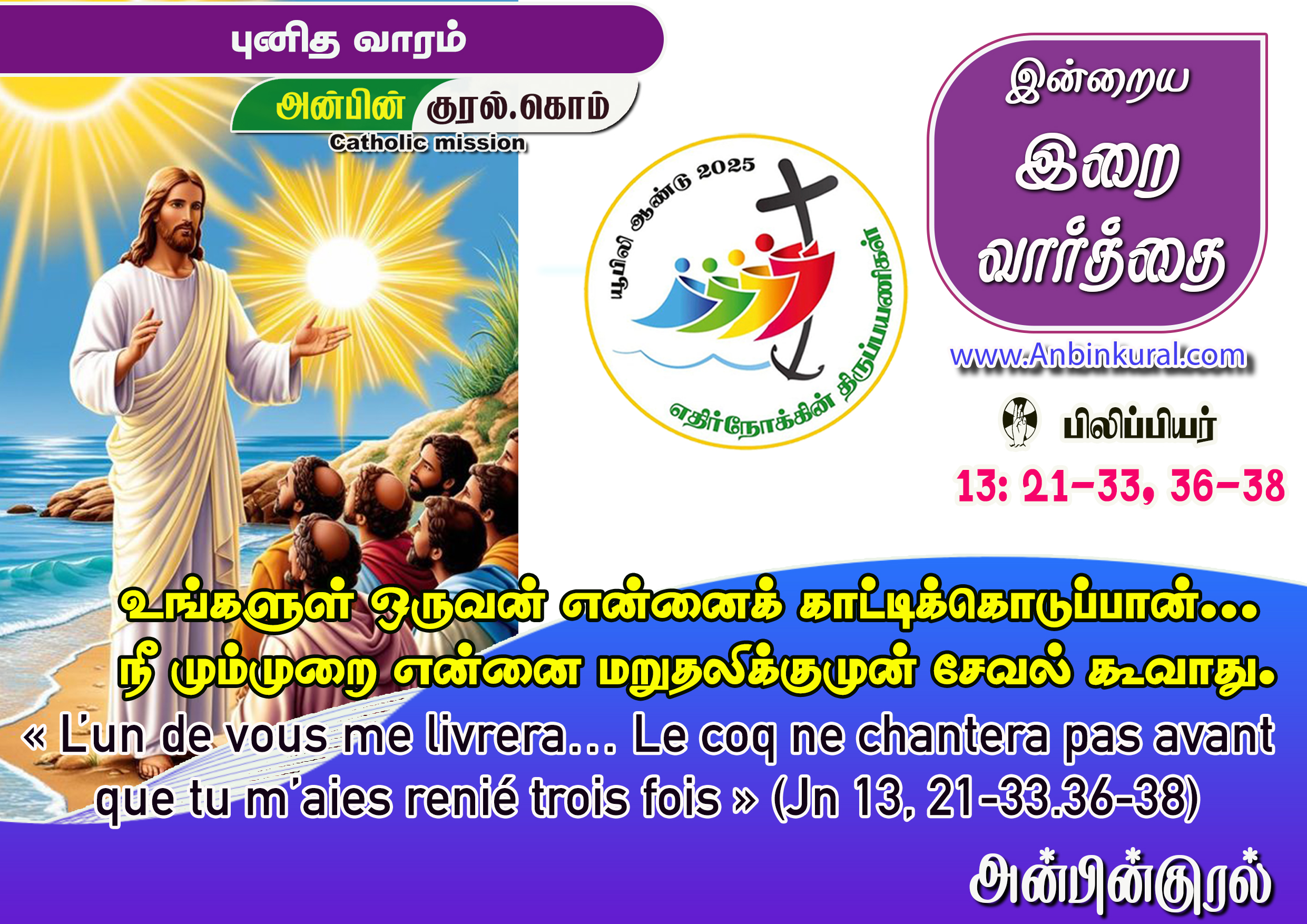 ✠ யோவான் எழுதிய தூய நற்செய்தியிலிருந்து வாசகம் 13: 21-33, 36-38