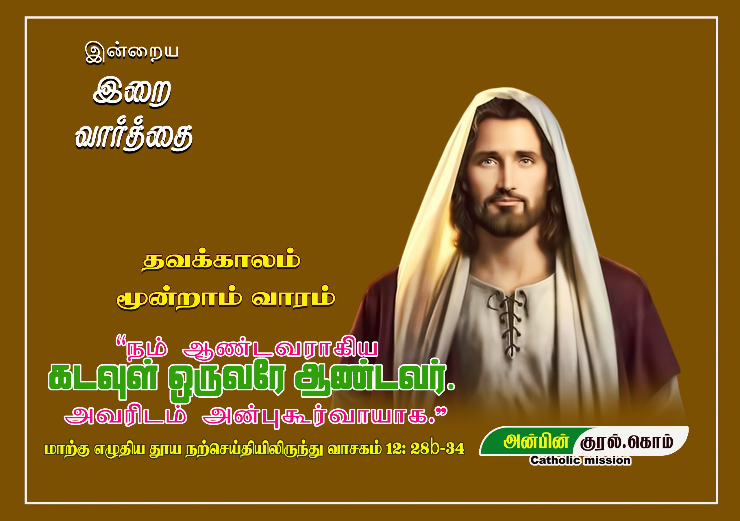 மறைநூல் அறிஞருள் ஒருவர், இயேசுவை அணுகி வந்து, “அனைத்திலும் முதன்மையான கட்டளை எது?” என்று கேட்டார். அதற்கு இயேசு, “ ‘இஸ்ரயேலே கேள். நம் ஆண்டவராகிய கடவுள் ஒருவரே ஆண்டவர். உன் முழு இதயத்தோடும் முழு உள்ளத்தோடும் முழு மனத்தோடும் முழு ஆற்றலோடும் உன் ஆண்டவராகிய கடவுளிடம் அன்புகூர்வாயாக’ என்பது முதன்மையான கட்டளை. ‘உன்மீது நீ அன்புகூர்வதுபோல் உனக்கு அடுத்திருப்பவர்மீதும் அன்புகூர்வாயாக’ என்பது இரண்டாவது கட்டளை. இவற்றைவிட மேலான கட்டளை வேறு எதுவும் இல்லை” என்றார்.