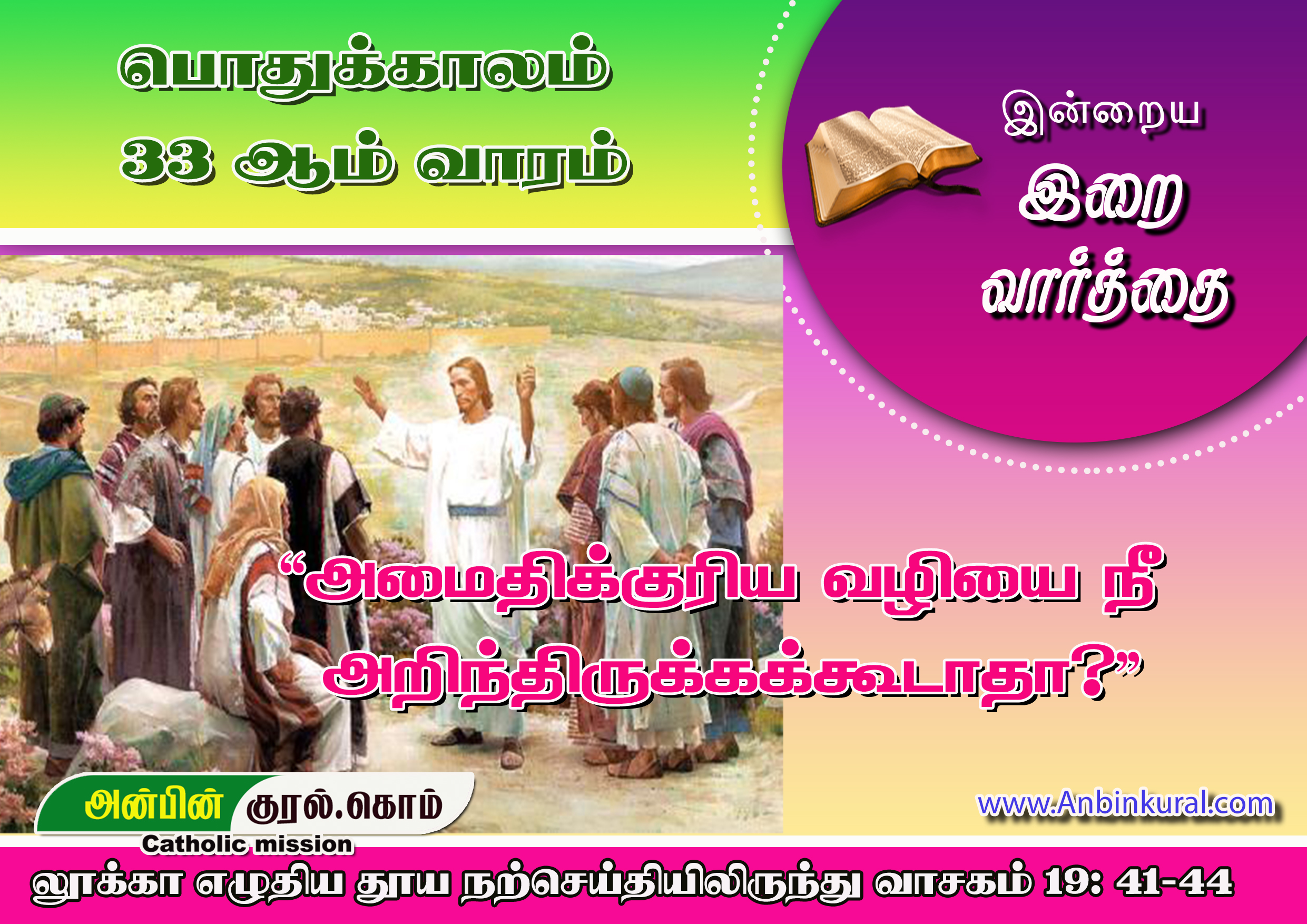 இயேசு எருசலேம் நகரை நெருங்கி வந்ததும் கோவிலைப் பார்த்து அழுதார். “இந்த நாளிலாவது அமைதிக்குரிய வழியை நீ அறிந்திருக்கக் கூடாதா? ஆனால் இப்போது அது உன் கண்களுக்கு மறைக்கப்பட்டுள்ளது.