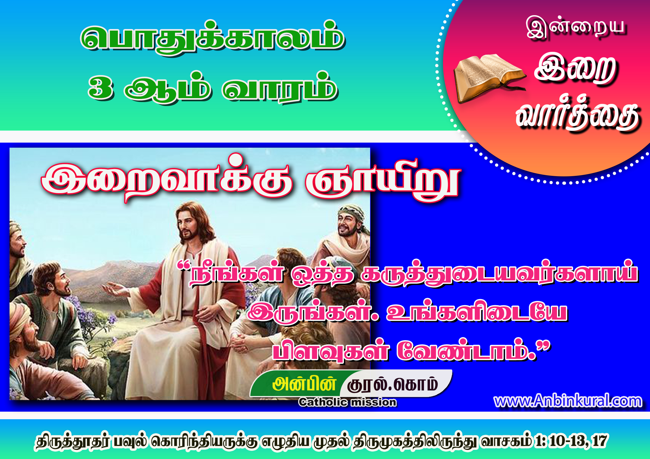 நம் ஆண்டவர் இயேசு கிறிஸ்துவின் பெயரால் நான் உங்களைக் கெஞ்சிக் கேட்டுக்கொள்வது இதுவே: நீங்கள் ஒத்த கருத்துடையவர்களாய் இருங்கள். உங்களிடையே பிளவுகள் வேண்டாம். ஒரே மனமும் ஒரே நோக்கமும் கொண்டிருங்கள்.