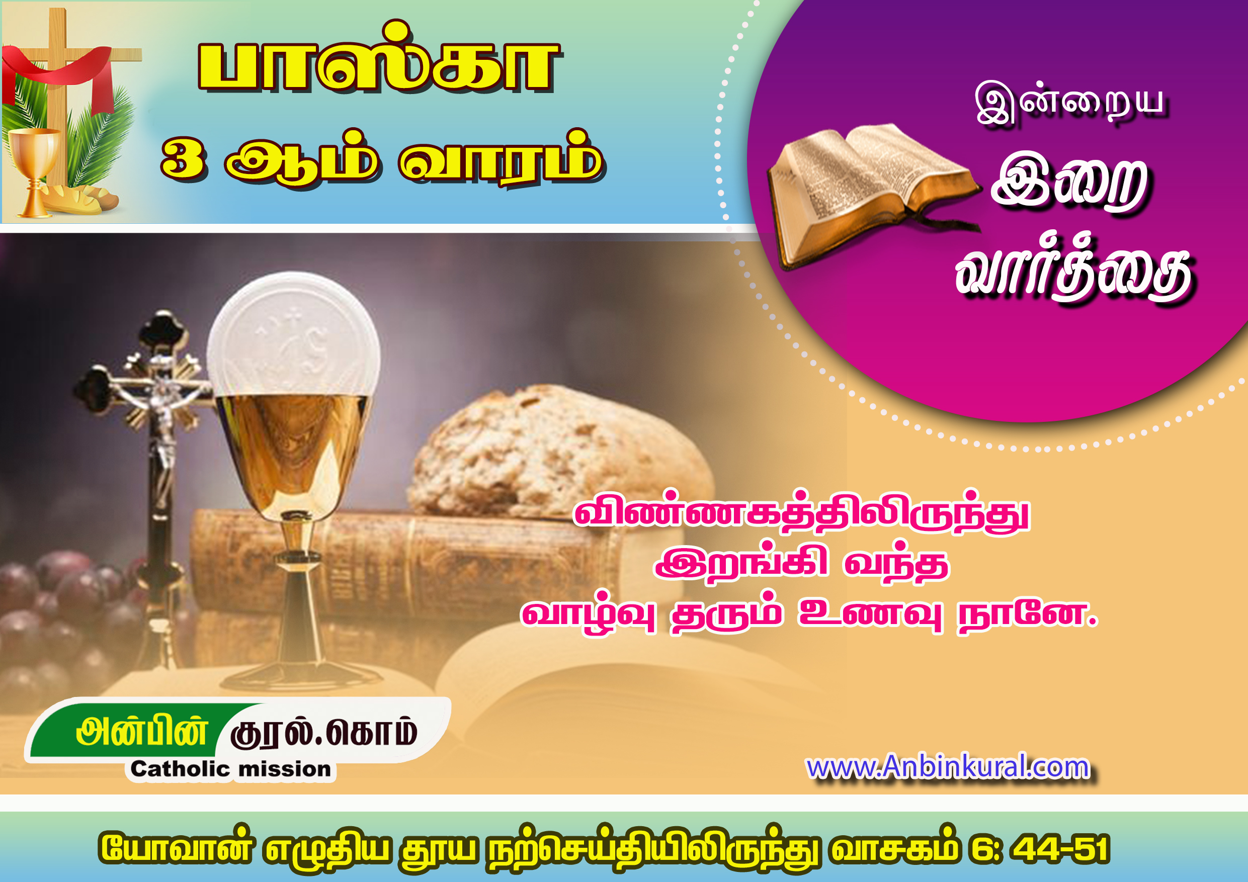 அல்லேலூயா, அல்லேலூயா! “விண்ணகத்திலிருந்து இறங்கி வந்த வாழ்வு தரும் உணவு நானே. இந்த உணவை எவராவது உண்டால் அவர் என்றுமே வாழ்வார்,” என்கிறார் ஆண்டவர். அல்லேலூயா.