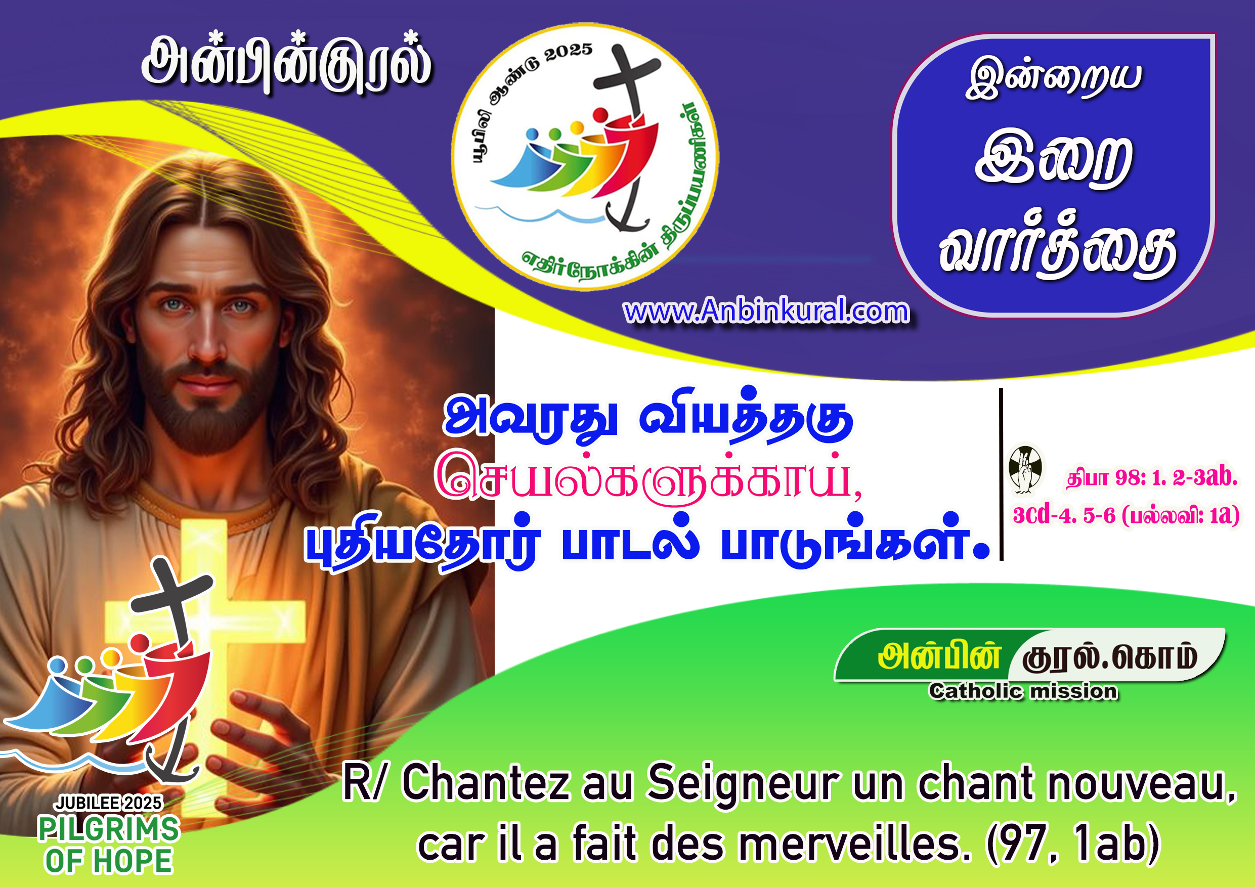 பல்லவி: அவரது வியத்தகு செயல்களுக்காய், புதியதோர் பாடல் பாடுங்கள்.1ஆண்டவருக்குப் புதியதொரு பாடல் பாடுங்கள்; ஏனெனில், அவர் வியத்தகு செயல்கள் புரிந்துள்ளார். அவருடைய வலக்கரமும் புனிதமிகு புயமும் அவருக்கு வெற்றியை அளித்துள்ளன. – பல்லவி