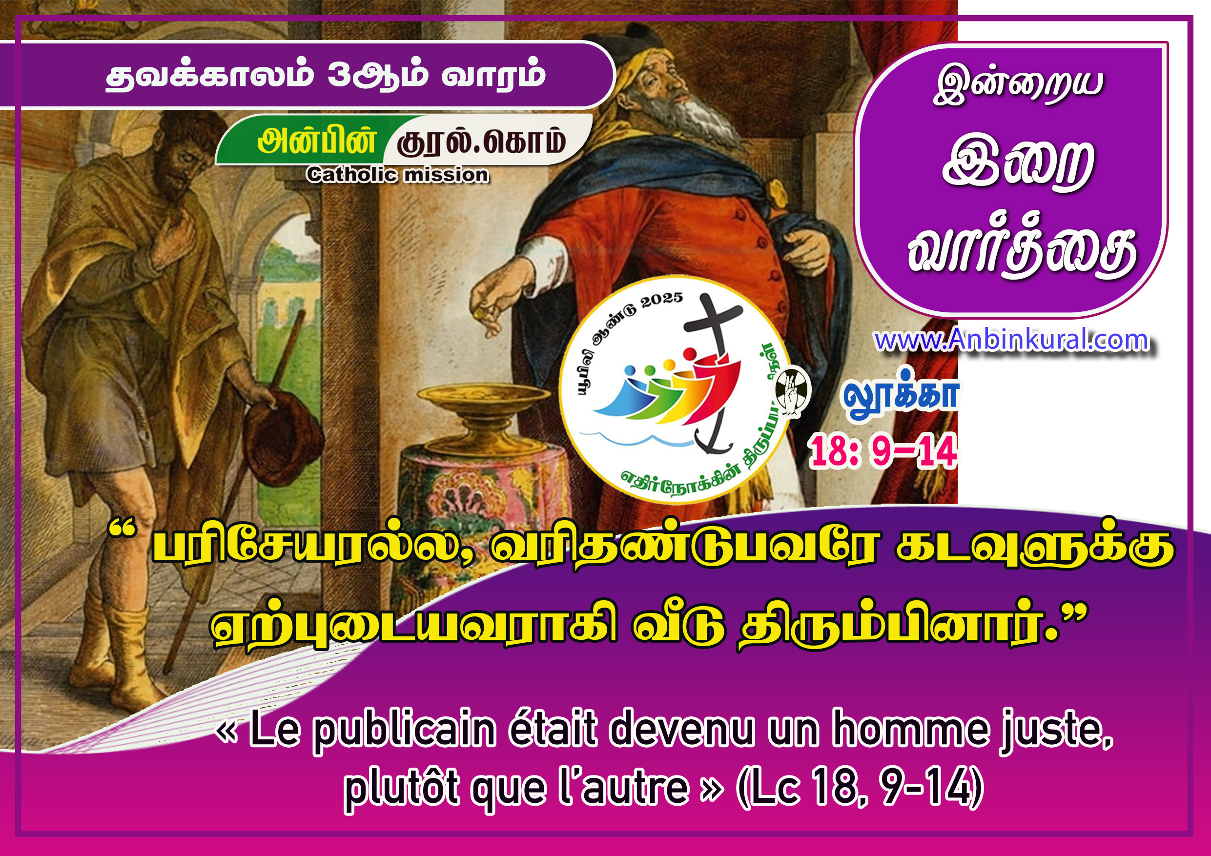 இயேசு, “பரிசேயரல்ல, வரிதண்டுபவரே கடவுளுக்கு ஏற்புடையவராகி வீடு திரும்பினார். ஏனெனில் தம்மைத் தாமே உயர்த்துவோர் தாழ்த்தப் பெறுவர்; தம்மைத் தாமே தாழ்த்துவோர் உயர்த்தப் பெறுவர் என நான் உங்களுக்குச் சொல்கிறேன்” என்றார்.